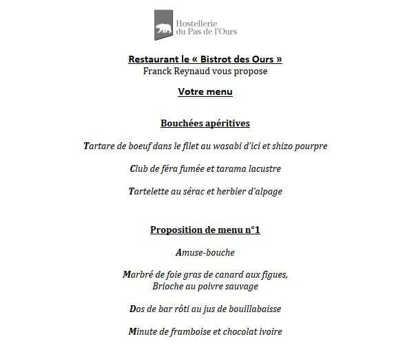 Grâce au soutien de notre partenaire Rothschild & Co, nous avons le plaisir de proposer, à des conditions financières avantageuses et sous la houlette du chef Franck Reynaud, un dîner à la suite de la conférence. Celui-ci se tiendra également à l’Hostellerie du Pas-de-l’Ours, et le menu est disponible ci-dessous.